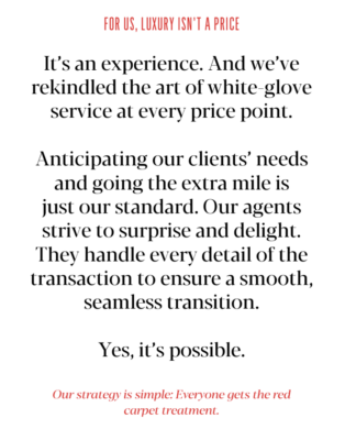 I work with photographers & videographers of the highest caliber and reputation to capture the essence of your property, in order to best present and amplify the unique beauty and value of your home, creating the perfect impression for buyers.